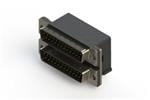 661 SERIES RIGHT ANGLE DUAL D-SUB PLUG OVER PLUG CONNECTOR EACH WITH 25 PIN TYPE CONTACTS THAT HAVE 30 GOLD PLATING. THE CONTACTS ARE STANDARD DUAL PORT 90 BEND PCB TERMINATION. THE BOARD MOUNTING FEATURES ARE 4 PRONG BOARDLOCKS,