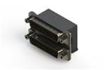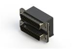 661 SERIES RIGHT ANGLE DUAL D-SUB PLUG OVER PLUG CONNECTOR EACH WITH 25 PIN TYPE CONTACTS THAT HAVE 15 GOLD PLATING. THE CONTACTS ARE STANDARD DUAL PORT 90 BEND PCB TERMINATION. THE BOARD MOUNTING FEATURES ARE 4 PRONG BOARDLOCKS,