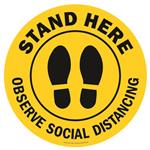 FLOOR SIGN, VINYL, 8" DIA, BLACK/YELLOW; Sign Type:Floor, Warning; Sign Legend:Stand Here - Observe Social Distancing; Sign Material:Vinyl; External Height:-; External Width:8"; Sign Colour:Black on Yellow; Product Range:- RoHS Compliant: NA