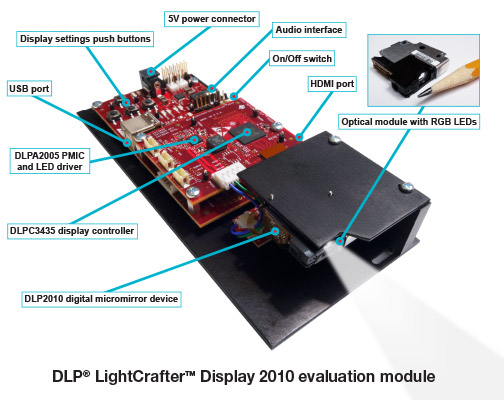 DLP LightCrafter Display 2010 is an easy to use, plug and play evaluation platform for the DLP2010 chipset, which includes the DLP2010 ( .2 WVGA) DMD, DLPC3435 display controller and DLPA2005 PMIC/LED driver. This EVM comes equipped with an optical engine that enables quick evaluation of the DLP2010 chipset for ultra-mobile and ultra-low power display applications. Its modular design allows the exchange of multiple light engines to fit diverse equipment design needs.